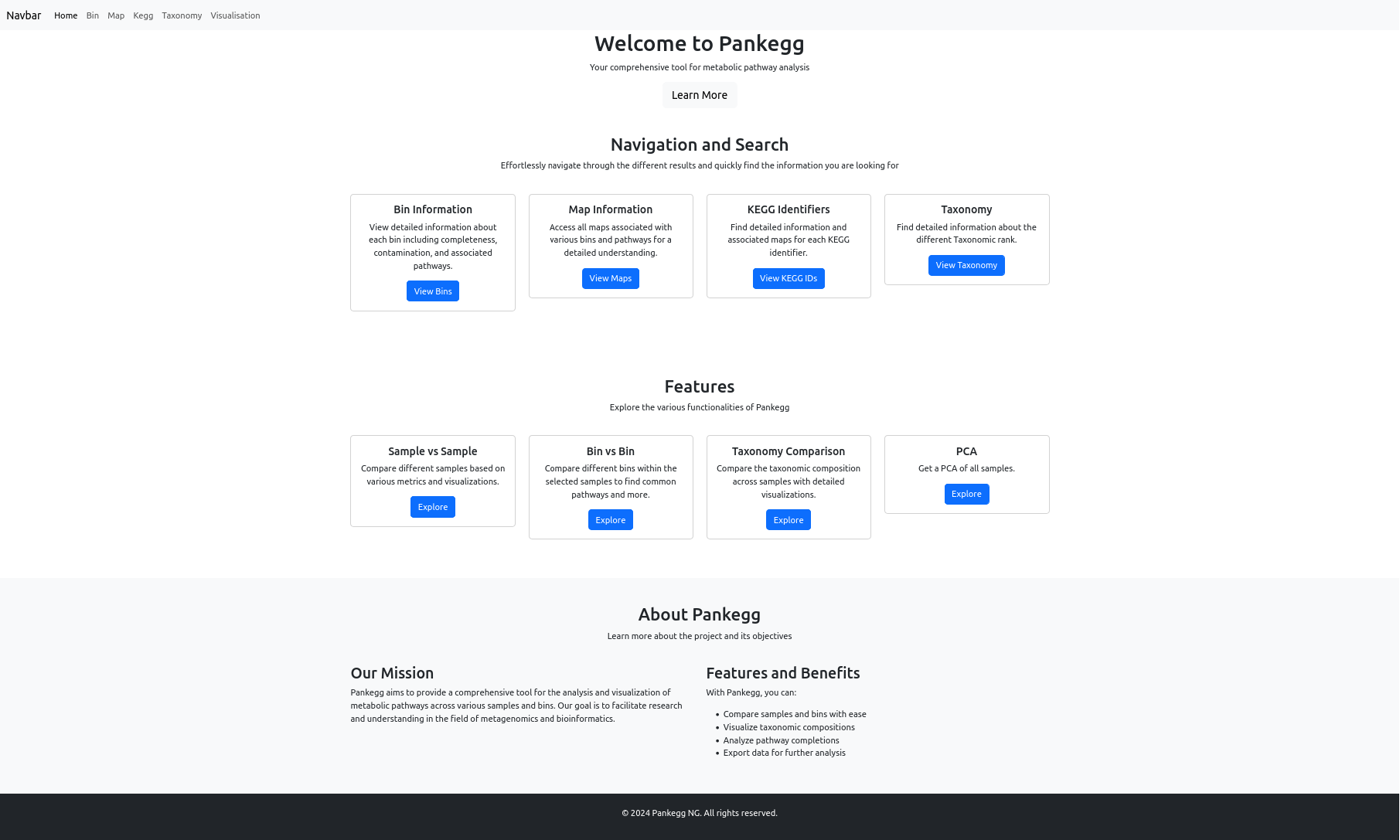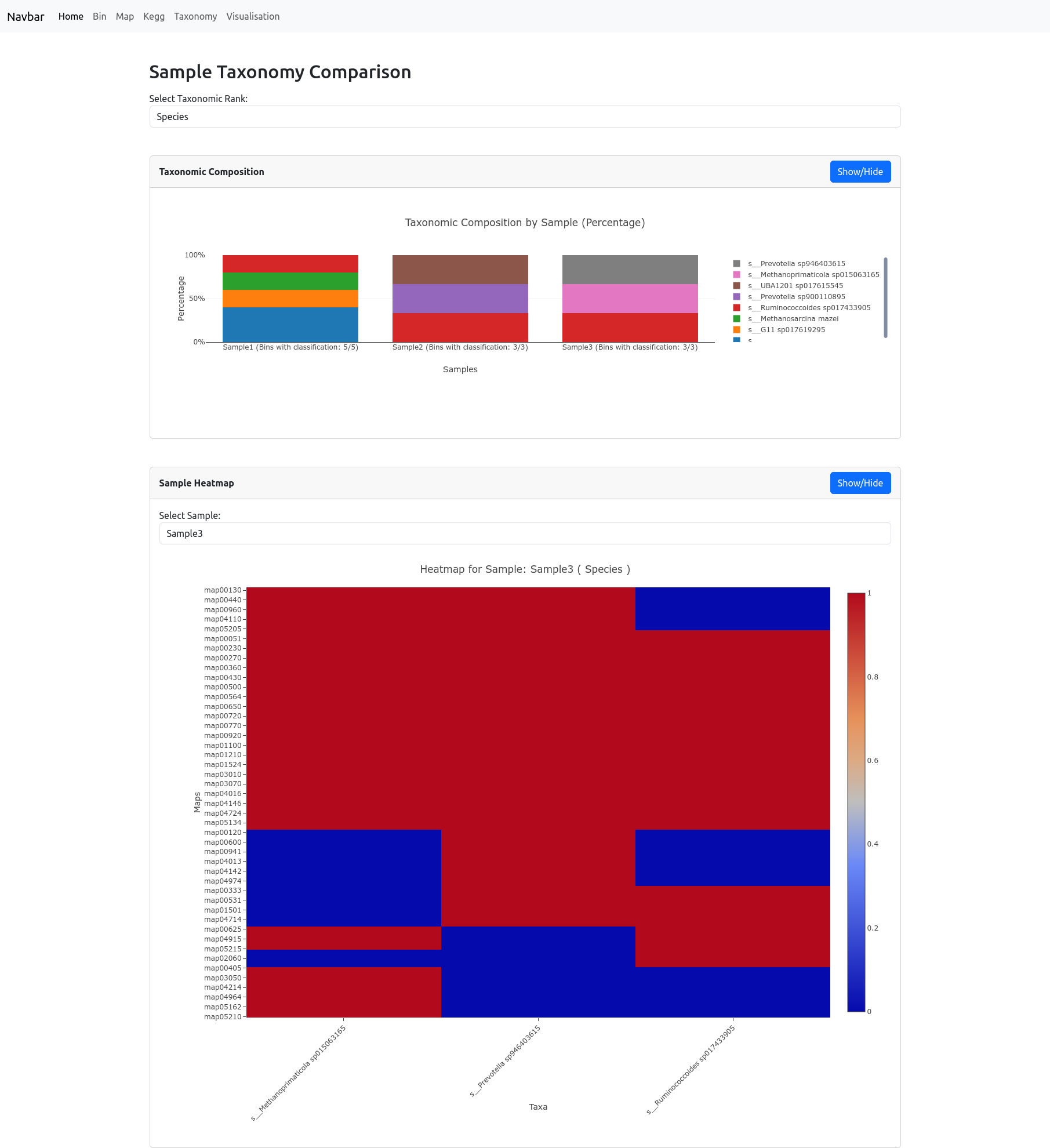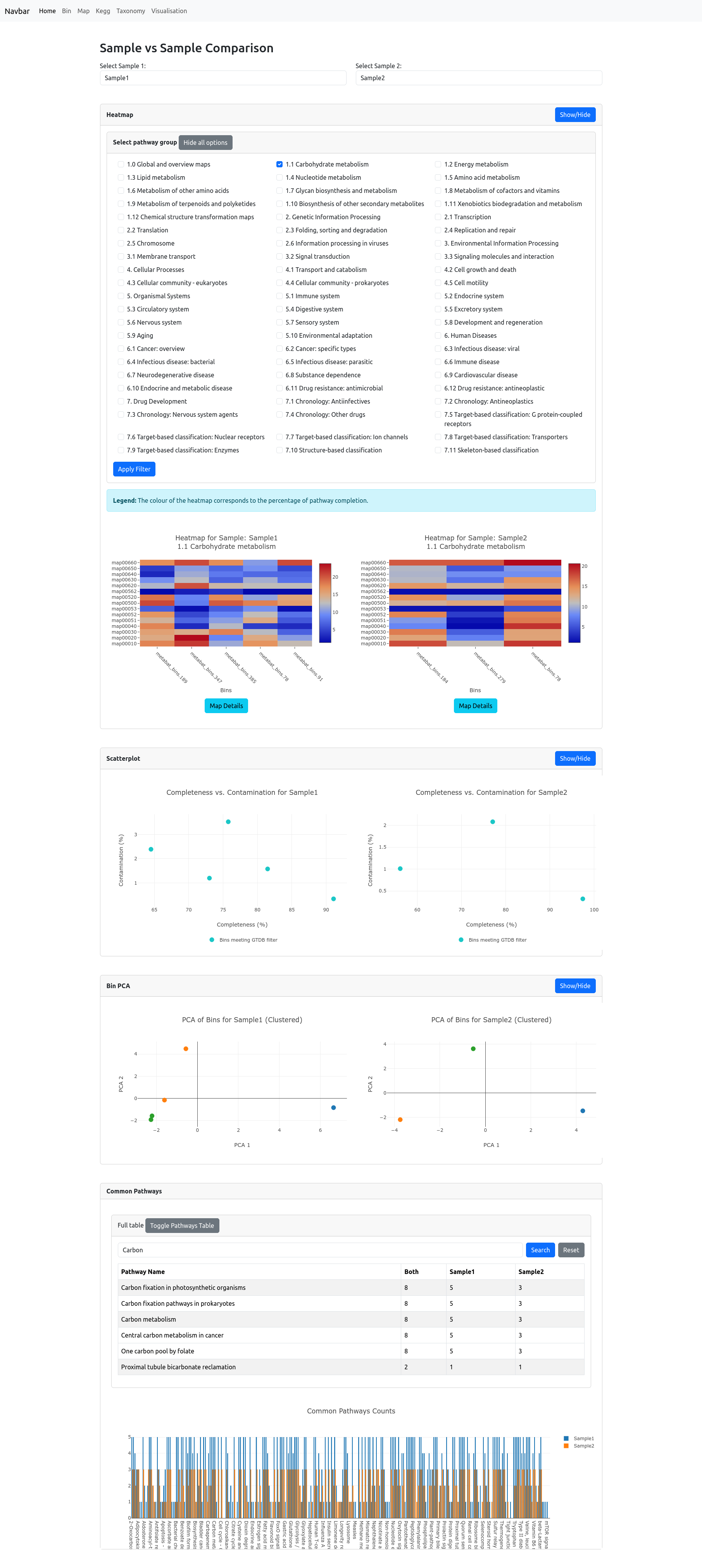 The landing page, Home, links to all elements that are also present in the navigation bar, and provides a short description for each one. Additionally, it shows the full content of the Visualisation page, Sample VS Sample; Bin VS Bin; Taxonomy comparison; PCA, and briefly describes each one.