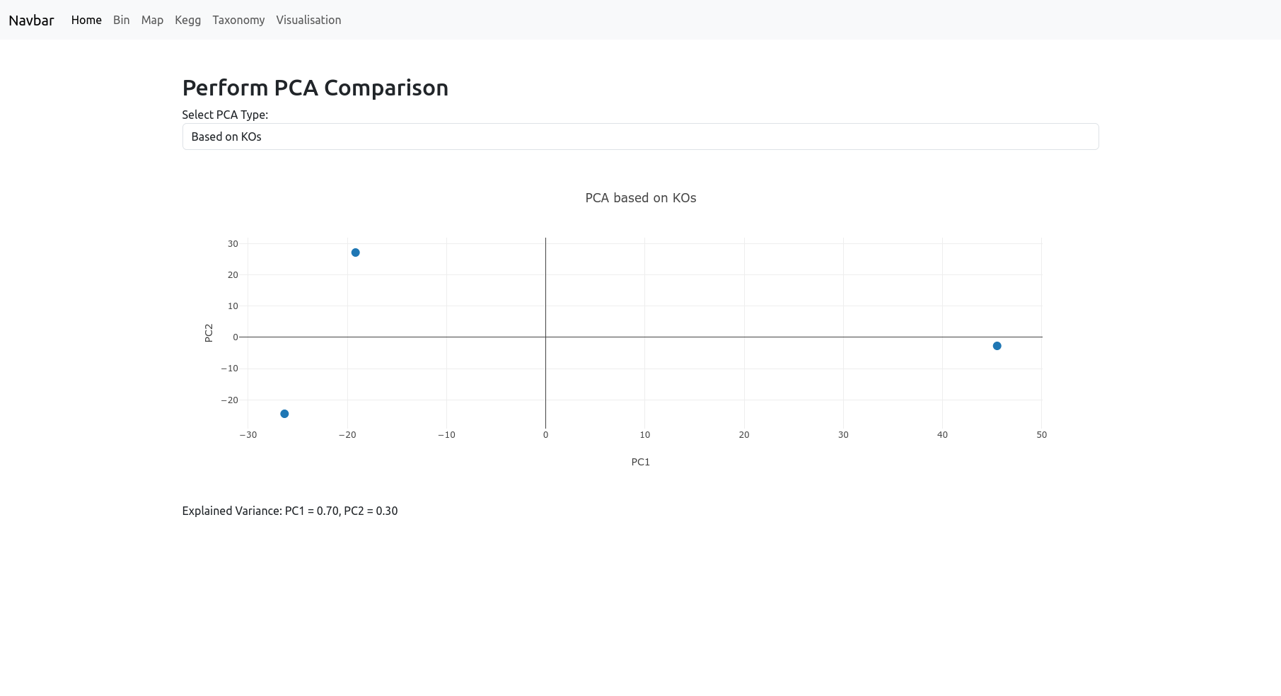The resulting PCA plot visualizes your samples in a reduced dimensional space, helping to highlight patterns, clusters, or differences driven by functional or taxonomic profiles. The explained variance for the principal components is displayed below the plot to indicate how much of the data’s variation is captured. Note: We recommend using this tool only if you have enough samples.