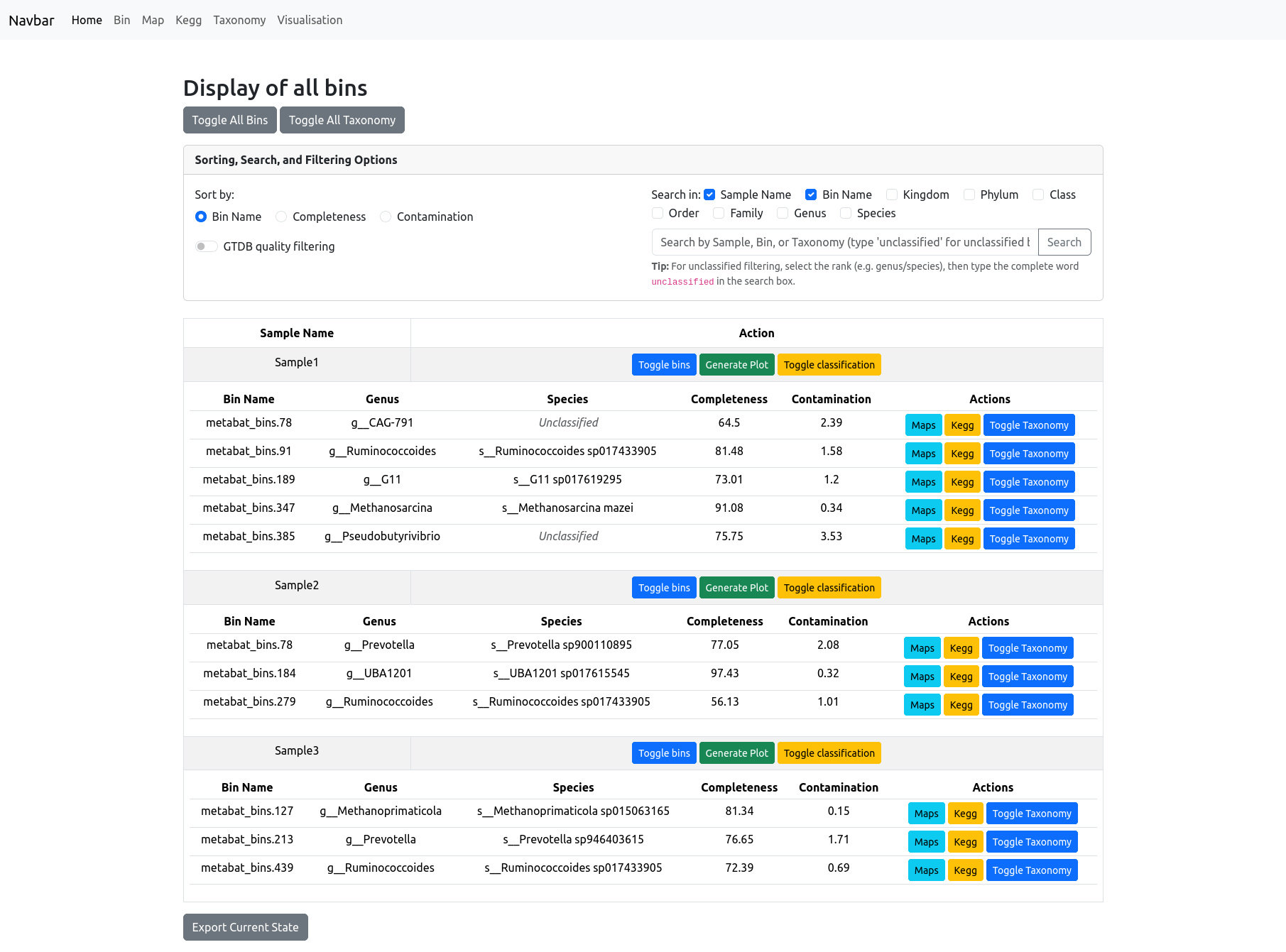 These features make it easy to explore, filter, and compare bin quality and taxonomy across all your samples.