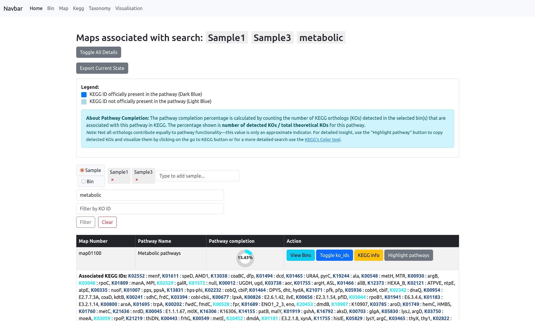 You can filter maps by sample, bin, pathway name, or KO identifier using the controls above the table. When filtering by bin or sample, the pathway completion percentage is recalculated to only include the KOs found within the selected bin(s) or sample(s), providing a focused view of its metabolic potential.