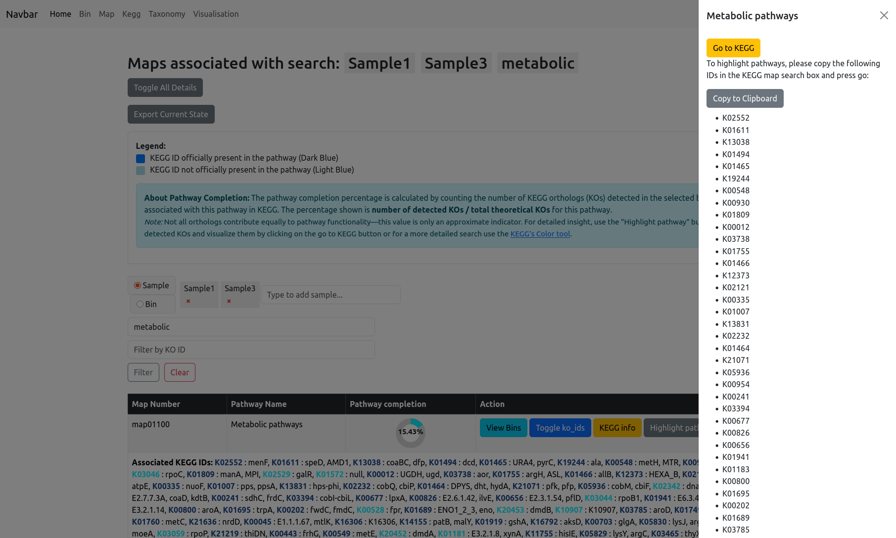 This combination of interactive filtering, KO details, and external links makes it easy to explore pathway presence, completion, and functional highlights across all your bins and samples.