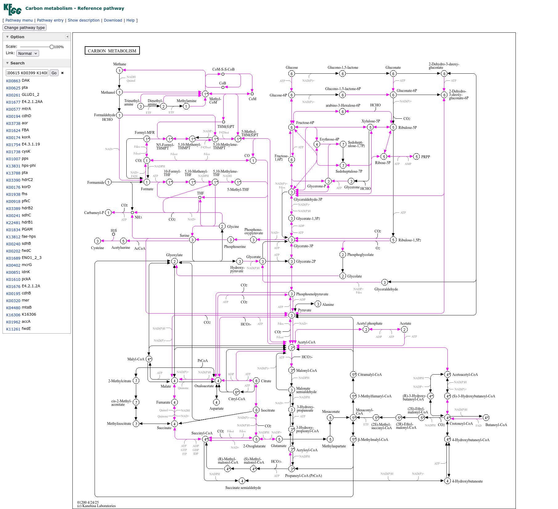 For examples the (Carbon Metabolism pathway)[https://www.kegg.jp/pathway/map01200] for Sample 1 and 3 of the test data contains: