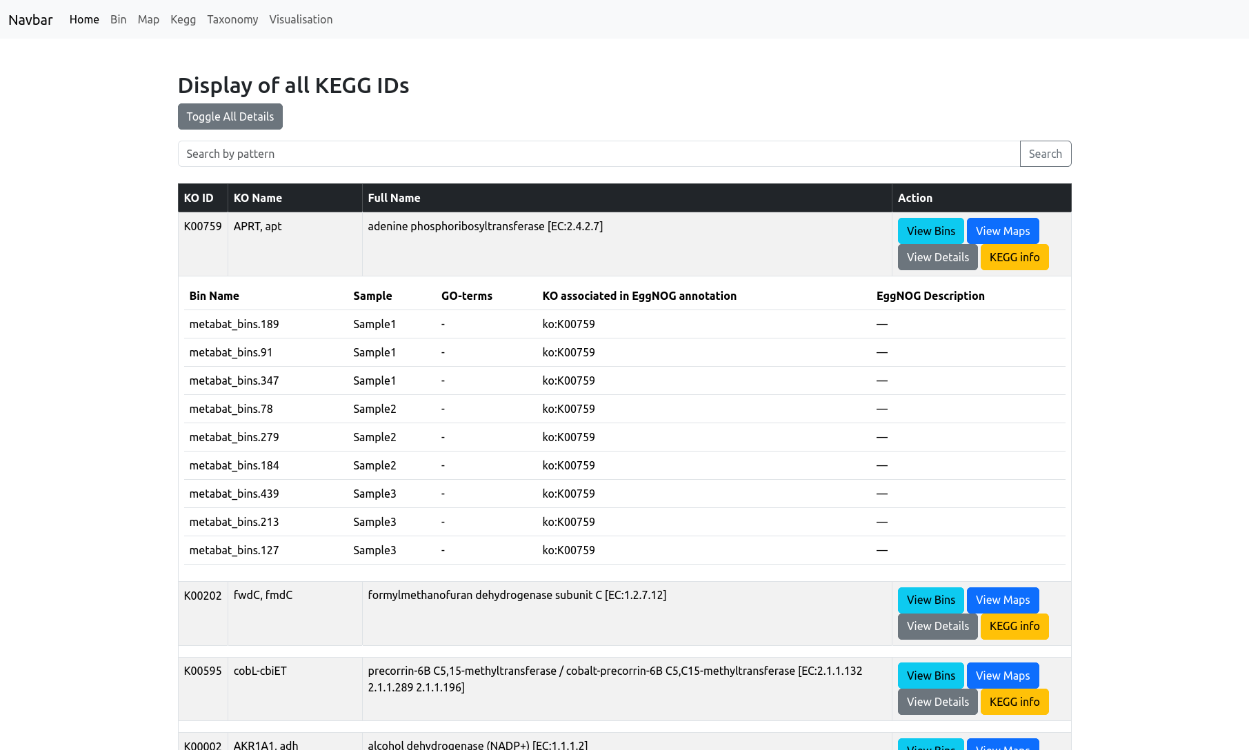 - View Details: Expand to show detailed information for each bin and sample in which the KO is present, including associated GO terms and EggNOG annotations, if available.