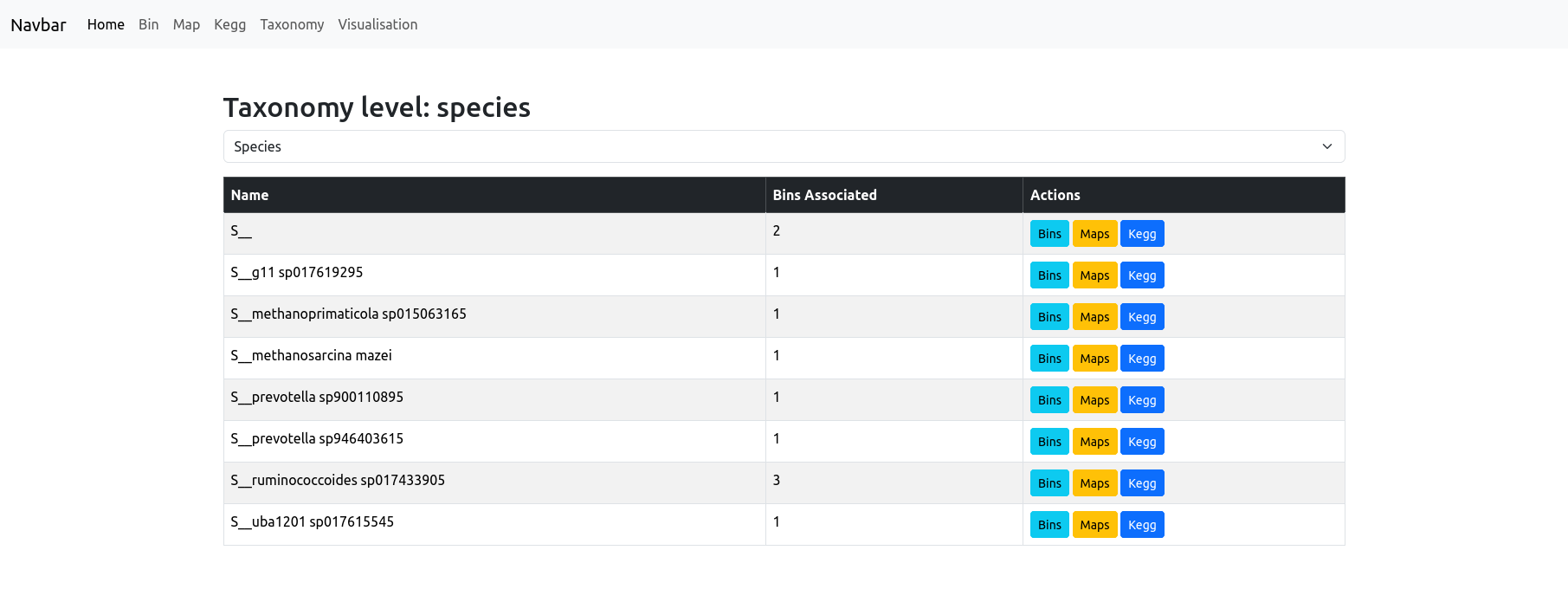 At the top, a navigation bar provides quick access to all major sections: Home, Bin, Map, Kegg, Taxonomy, and Visualisation. Each of these sections links to a page where you can browse detailed information about your bins, pathway maps, KEGG identifiers, and taxonomic classifications, or use the different interactive visualisation tools. The navbar ensures that you can switch between functional modules.