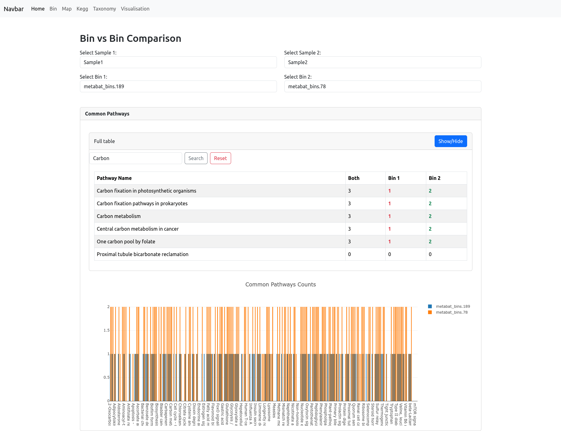 The Bin vs Bin comparison page allows you to directly compare the metabolic potential of any two bins, whether they belong to the same sample or to different samples. After selecting two bins, the page displays a table listing all metabolic pathways, showing the count of orthologs detected in both bins, or uniquely in each bin. You can use the search bar to filter pathways of interest.
